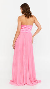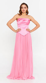 Chic ensemble featuring a structured satin corset with elegant V-shaped draping, paired with a flowing pleated skirt for a balance of sophistication and movement.