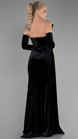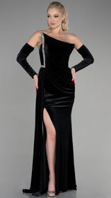 - Luxurious and eye-catching, this velvet gown features a soft draped silhouette, sparkling rhinestone details, and optional sleeves for versatile styling. Rich texture meets elegant for making a statement.