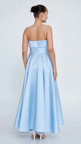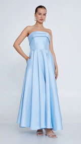 Elegant ankle-length dress made from blue satin, designed for timeless sophistication and comfort.