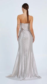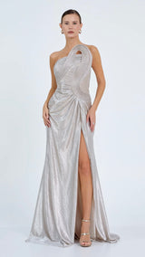 Striking metallic silver gold gown designed with a fluid draped swirl detail and a daring slit for modern elegance and movement.