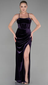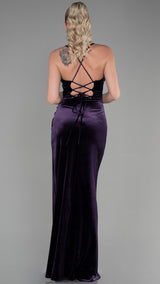 - This stretch velvet gown features a draped corset bodice, a flowing draped skirt, and a high slit for a touch of allure. The lace-up back detail adds a romantic finish, and makes it easier to fit more sizes.