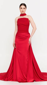 Elegant satin mermaid gown featuring a sleek fitted silhouette and a dramatic extended back skirt for timeless sophistication.