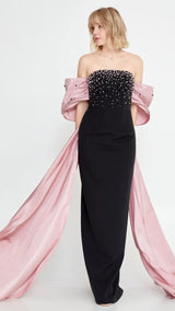 Add sparkle and versatility to your wardrobe with this stunning dress featuring rhinestone embellishments and a large detachable bow at the back for a customizable look. Its flattering silhouette transitions effortlessly from formal events to cocktail parties and elegant evenings.