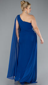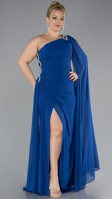 Royal blue one-shoulder gown designed with sleek lines and a bold slit for a modern, elegant statement.