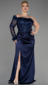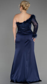 Chic blue one-sleeve gown embellished with delicate beading on the bodice for a sophisticated, modern look.