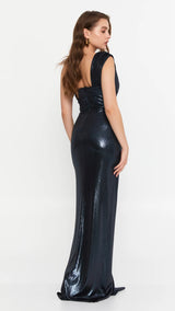 Striking metallic dark blue gown designed with a fluid draped swirl detail and a daring slit for modern elegance and movement.