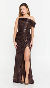 Striking metallic brown dress featuring a sculpted draped design and a bold one-shoulder sleeve for glamour.