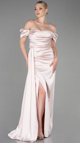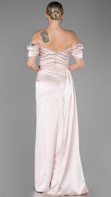 • Moeiteloze elegantie in deze volledig satijnen jurk met sierlijke off-shoulder mouwen en een zacht gedrapeerd design. Soepel, luxueus en perfect voor elke speciale gelegenheid.